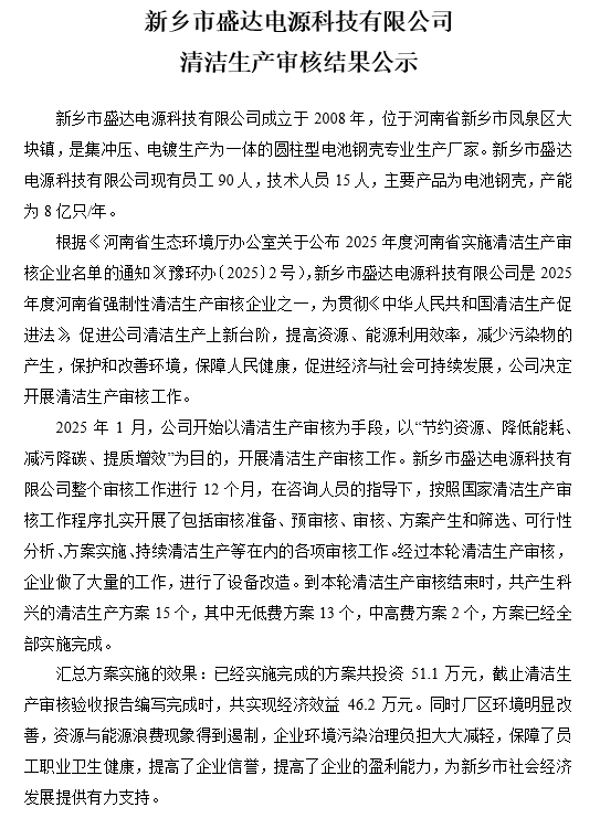 新乡市盛达电源科技有限公司清洁生产审核结果公示